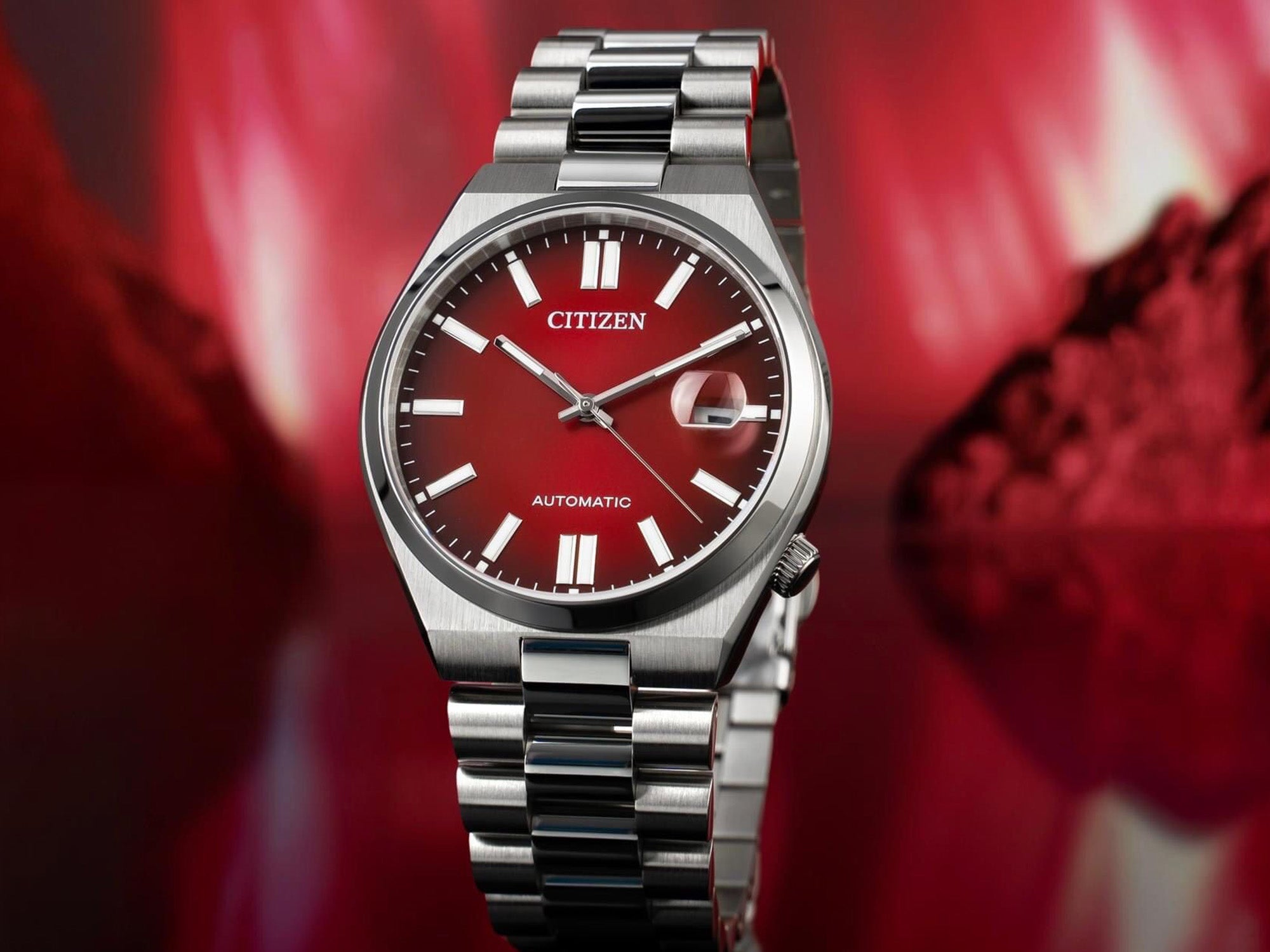 قیمت: 475 دلار، اندازه قاب: 40 میلیمتر، ضخامت: 11.7 میلیمتر، شیشه: یاقوت کبود، مقاومت در برابر آب: 50 متر، حرکت: خودکار Caliber 8210. Citizen (سیتیزن) با استفاده از گردش حرکات مکانیکی، سری «Tsuyosa» (تسوئوسا) را تشکیل داده که توانمند و مقاوم است. این نسخه با یک صفحه بورگاندی نوعی ظرافت چشمگیر را به نمایش گذاشته است.