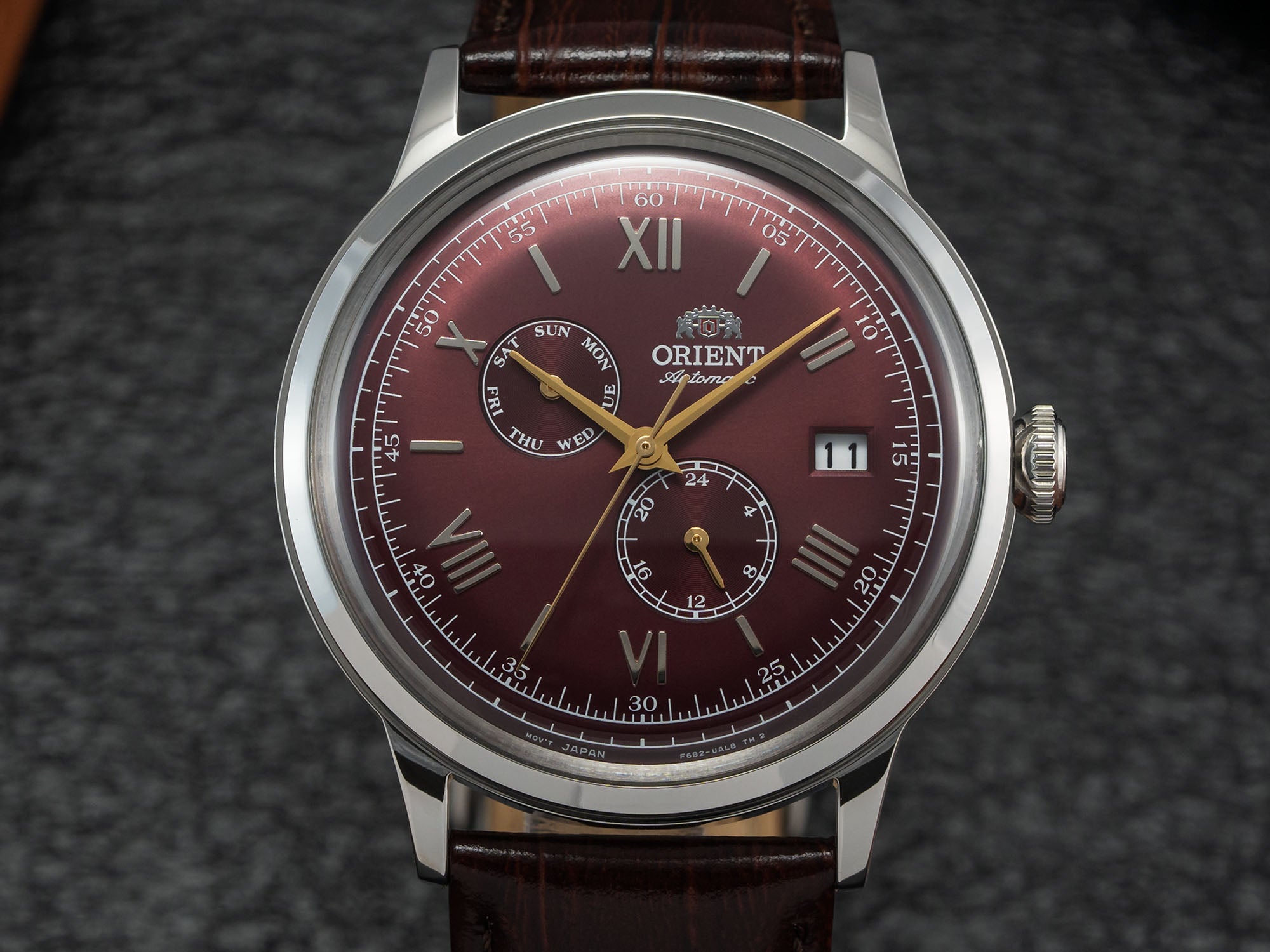 قیمت: 430 دلار، اندازه قاب: 40.5 میلیمتر، ضخامت: 12.6 میلیمتر، عرض بند: 21 میلیمتر، شیشه: معدنی، مقاومت در برابر آب: 30 متر، حرکت: خودکار F6B22. اگرچه بسیاری از مصرفکنندگان آمریکایی این برند را نادیده گرفتهاند اما Orient (اورینت) با مدل Bambino (بامبینو) طرحهای شیک و اغلب سادهای ارائه میدهند. ساعت Bambino Day-Date (بامبینو دِی-دِیت) دارای صفحه قرمز و اعداد رومانی برای نشان دادن ساعت میباشد. با یک حرکت خودکار ژاپنی کالیبر F6B22 شگفتانگیز است.