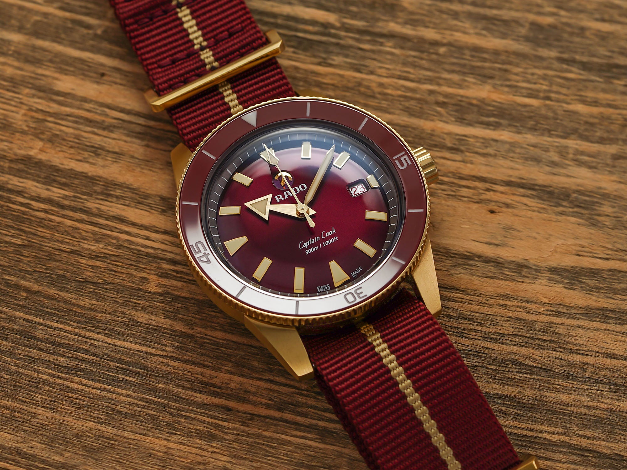 قیمت: 3,050 دلار، اندازه قاب: 42 میلیمتر، ضخامت: 12.5 میلیمتر، شیشه: یاقوت کبود، مقاومت در برابر آب: 300 متر، حرکت: خودکار ETA C07.611. برند Rado (رادو) با ارائه مدل Captain Cook (کاپیتان کوک) پیچیدگیهای طراحی خود را به نمایش میگذارد و صفحه بورگاندی و قاب برنزی این مدل به جذابیت آن میافزاید.